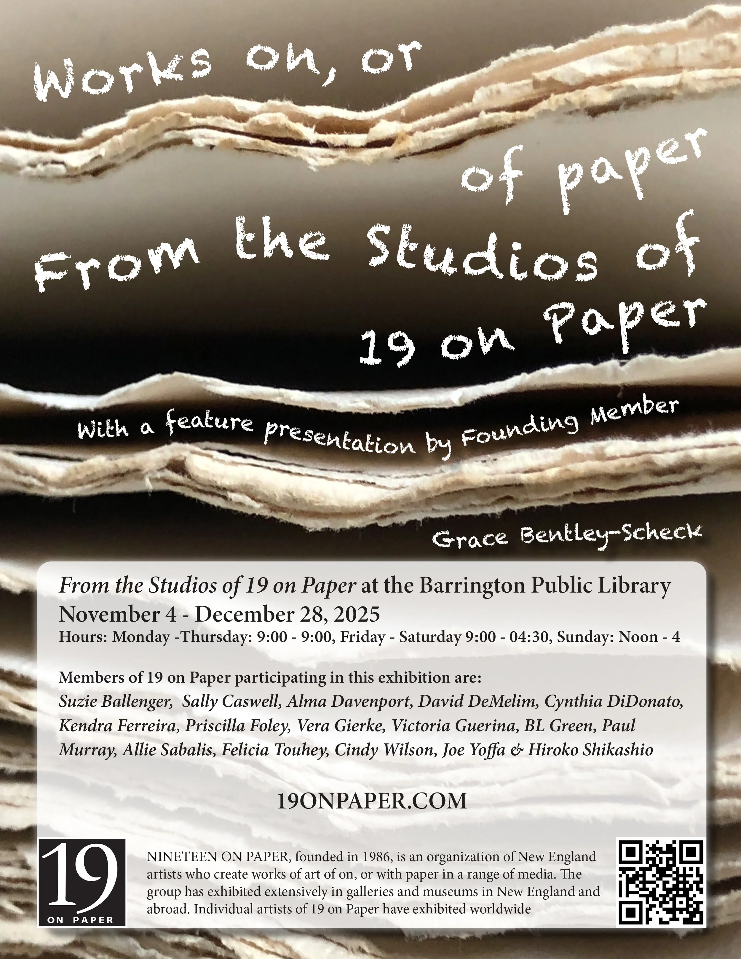 NINETEEN ON PAPER, founded in 1986, is an organization of New England artists who create works of art of on, or with paper in a range of media. The group has exhibited extensively in galleries and museums in New England and abroad. Individual artists of 19 on Paper have exhibited worldwide